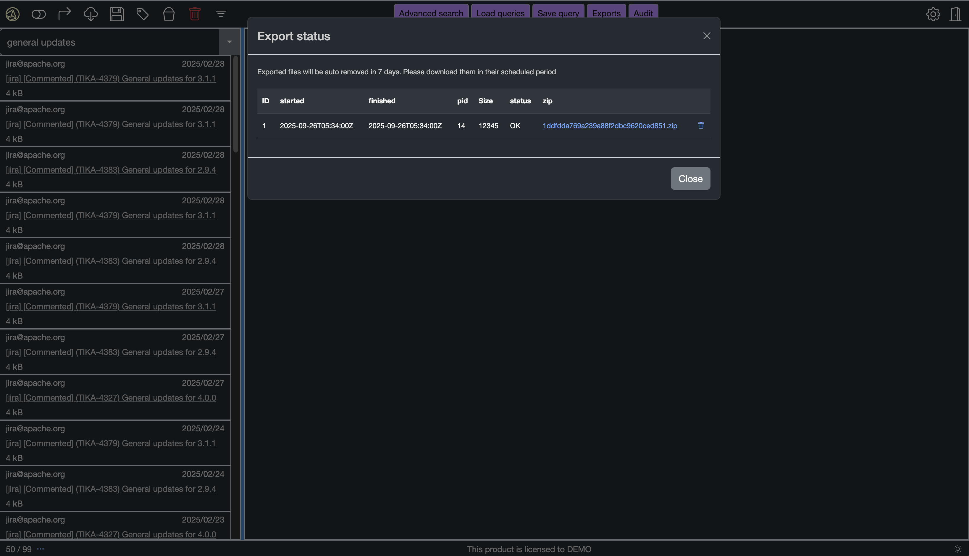 You may download 20-100 emails from the UI at the same time by selecting them. What if you entered a search query, and it produced 5000 hits, and you need all of them?