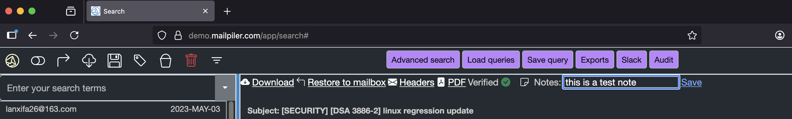 You may assign notes to individual messages. To do that select the given message, and type your notes on the preview window in the lower pane, then finally click on the “Save” button.
