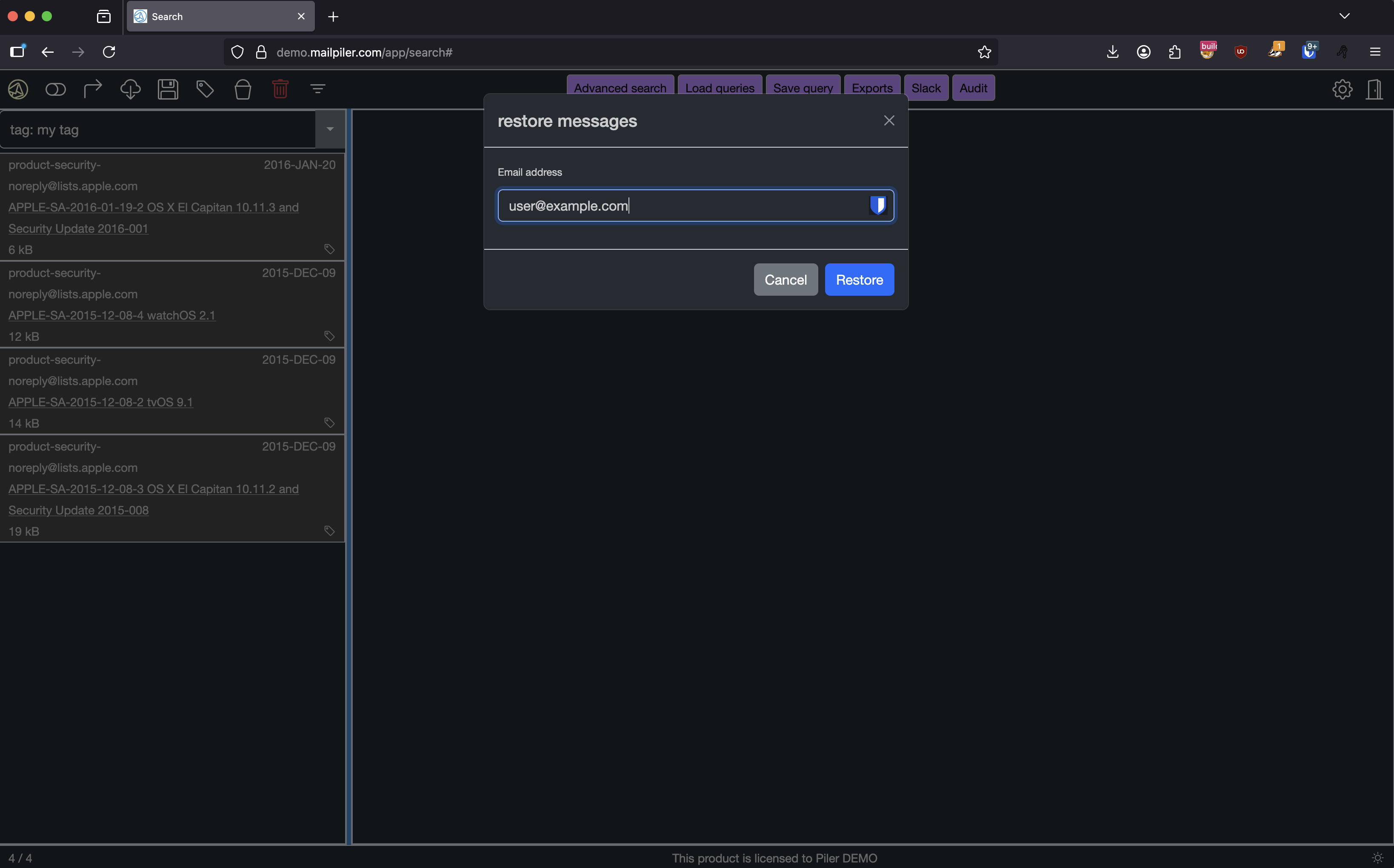 Just as with the download feature, you may also restore several messages at a time. Select the messages you want to restore, then click on the right arrow icon on the top left icon bar.