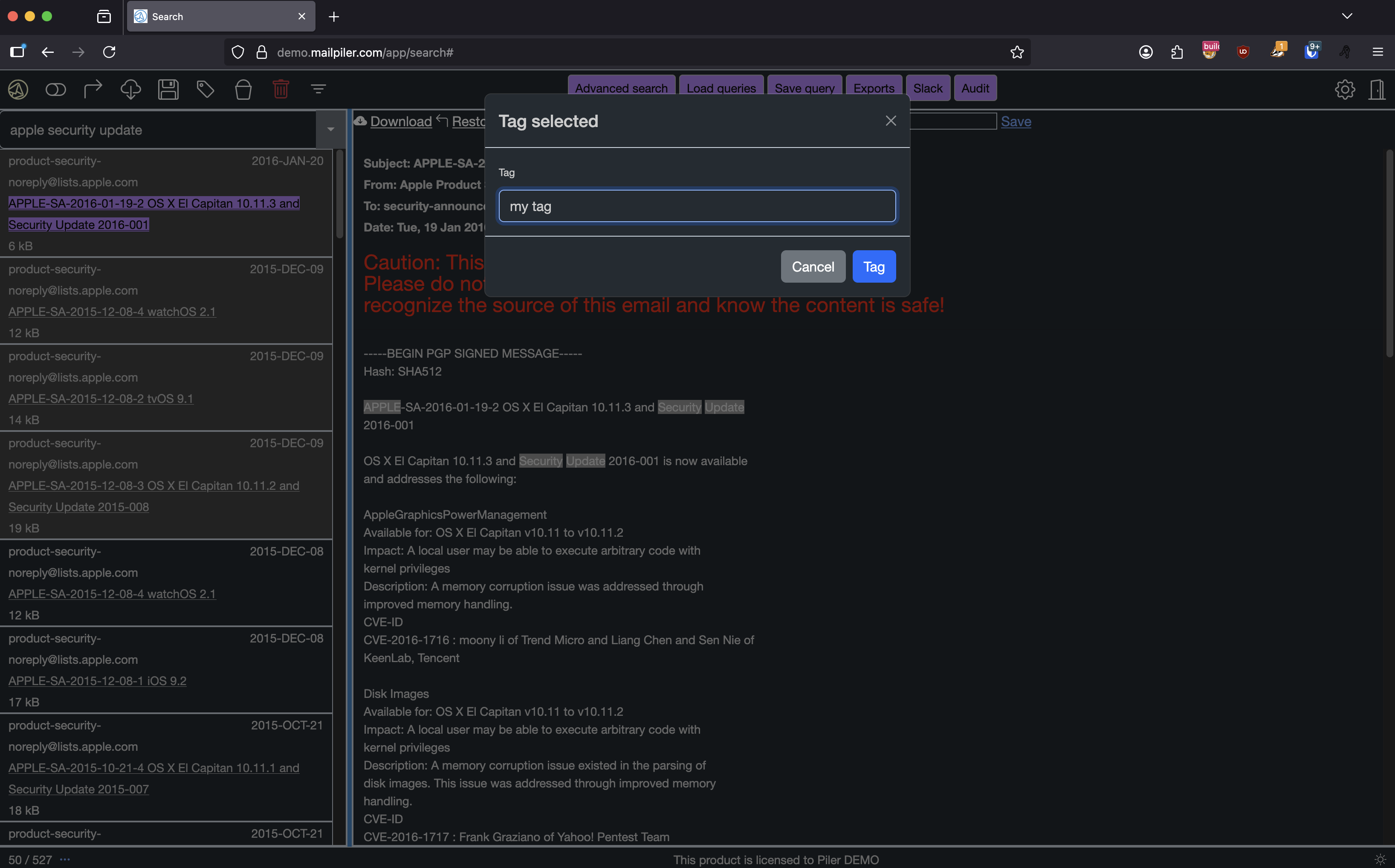 You may assign tags to selected emails. To do that perform a query providing the search results you want to tag, then select the appropriate messages you want to tag. Enter the tag name to the input field, and finally click on the tag icon.